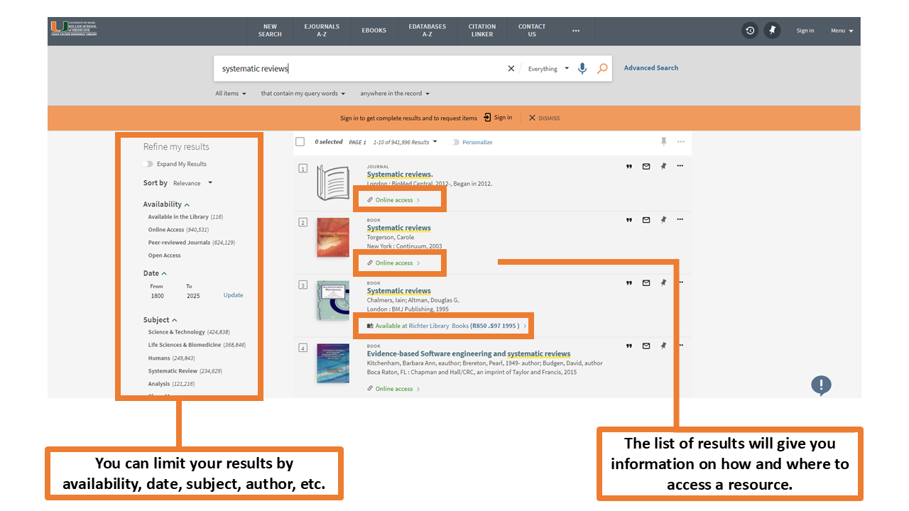 On the results page, you will find the list of results matching your search. On the left-hand side, you can further limit your search results by date, language, subject, etc.